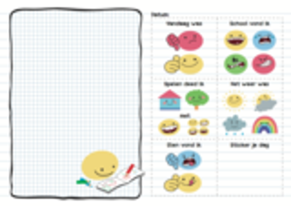 Kleuters hebben hun eigen vrolijke dagboek: het KleuterSmoeltjesSchrift. Aan de hand van gekleurde smileys kunnen ze aangeven hoe hun dag was. Hoe voelde je je op school? En was het eten lekker? Voor ‘bijzondere dingen’ als verjaardagen of een zwemdiploma zijn er toepasselijke stickers om de pagina mee op te fleuren. Daarnaast is er natuurlijk ruimte voor tekenen, kleuren en leuke opdrachtjes.