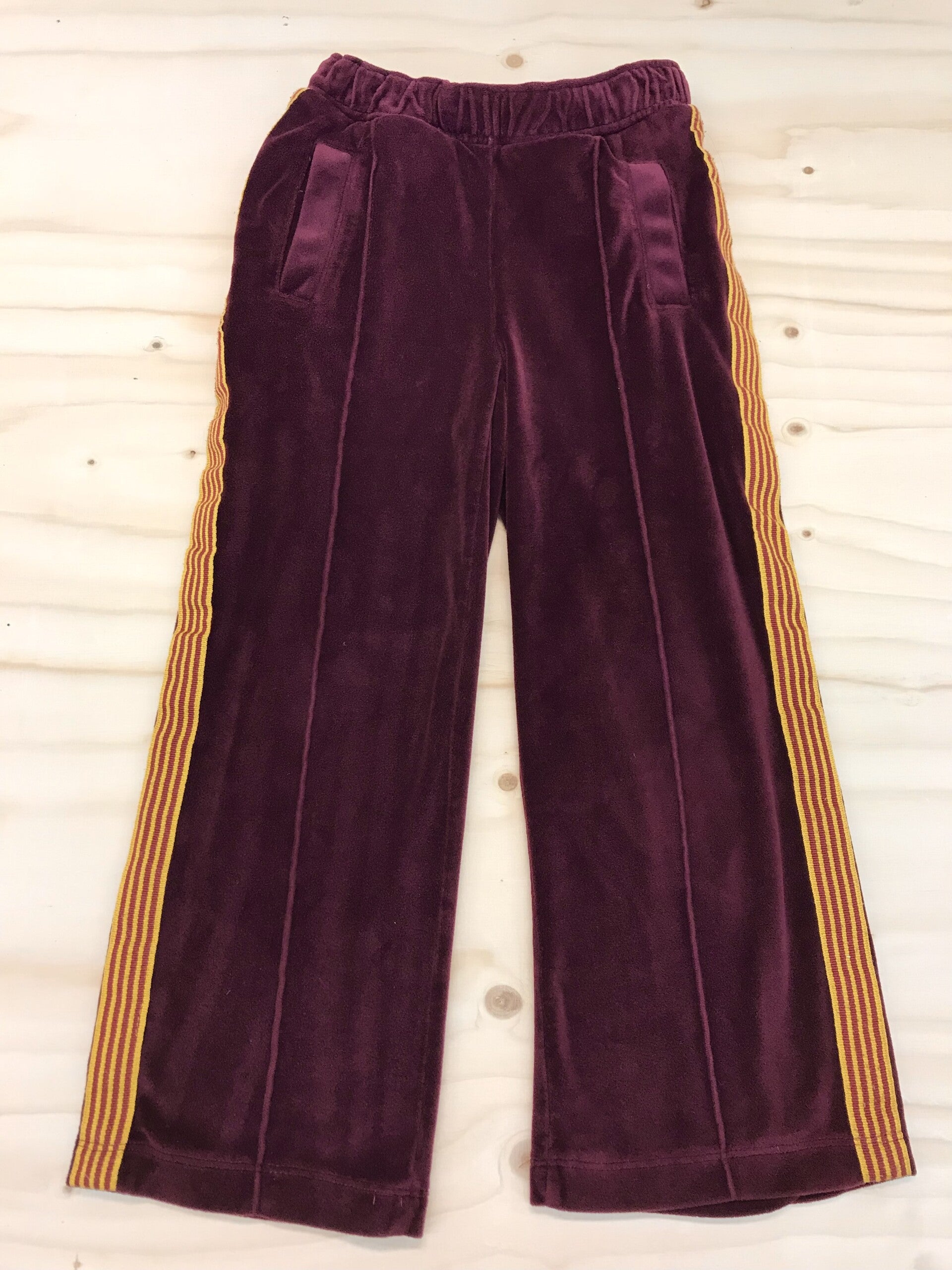 Prachtige fluwelen broek in mooi bordeaux en geel randje. Lekker warm!